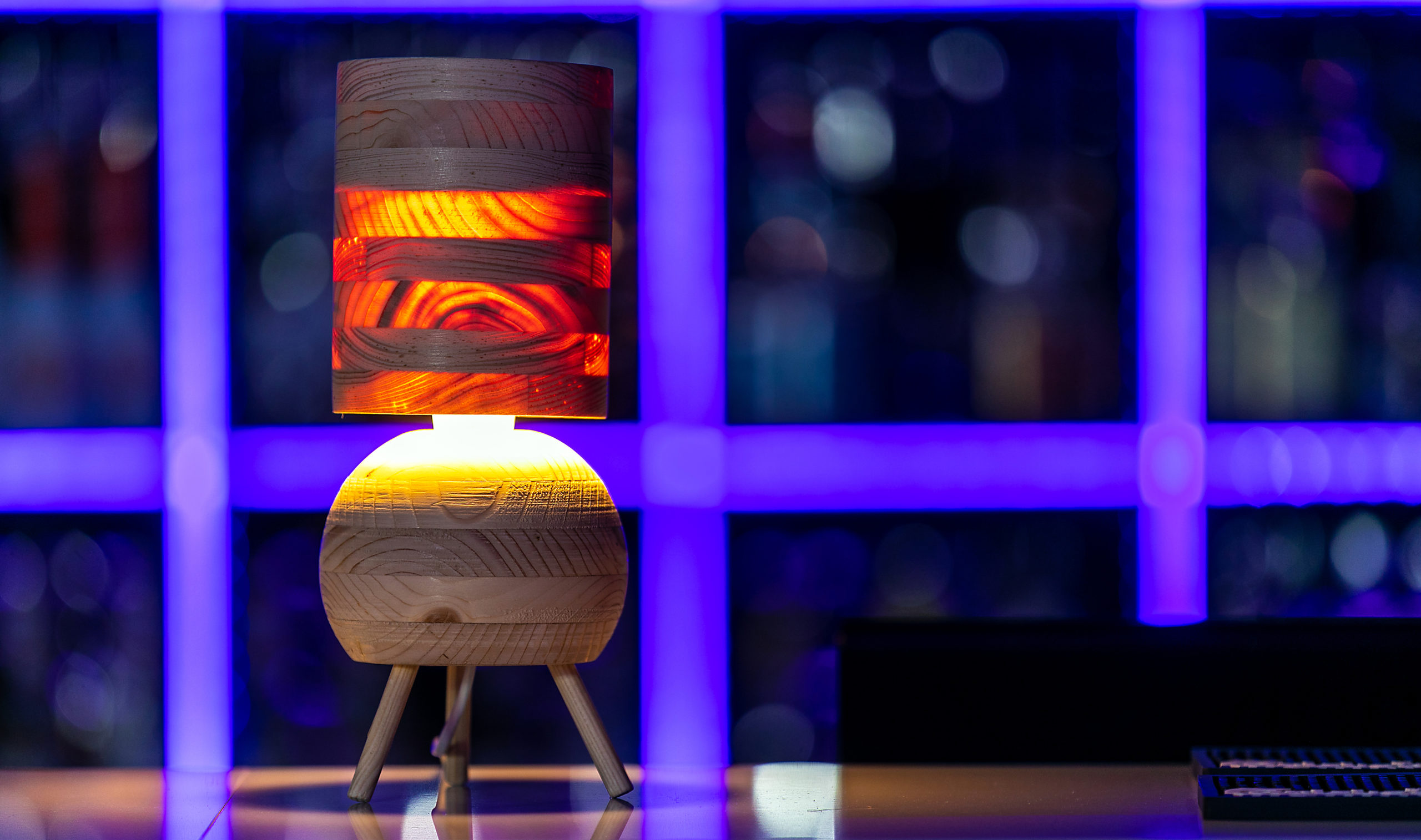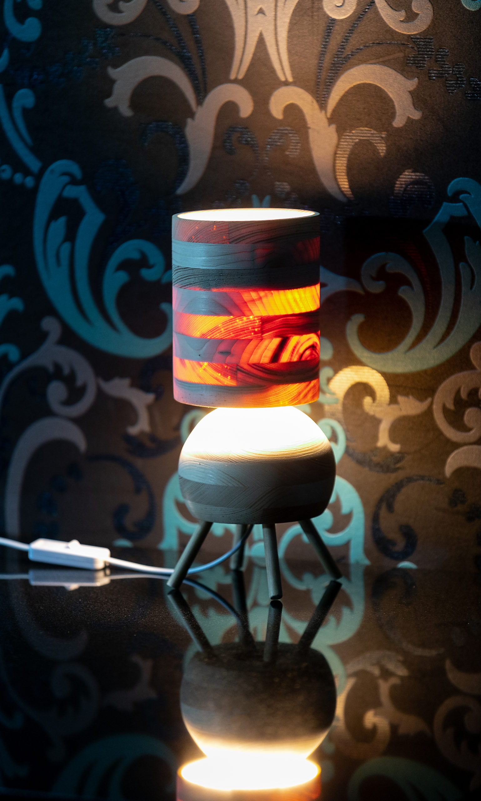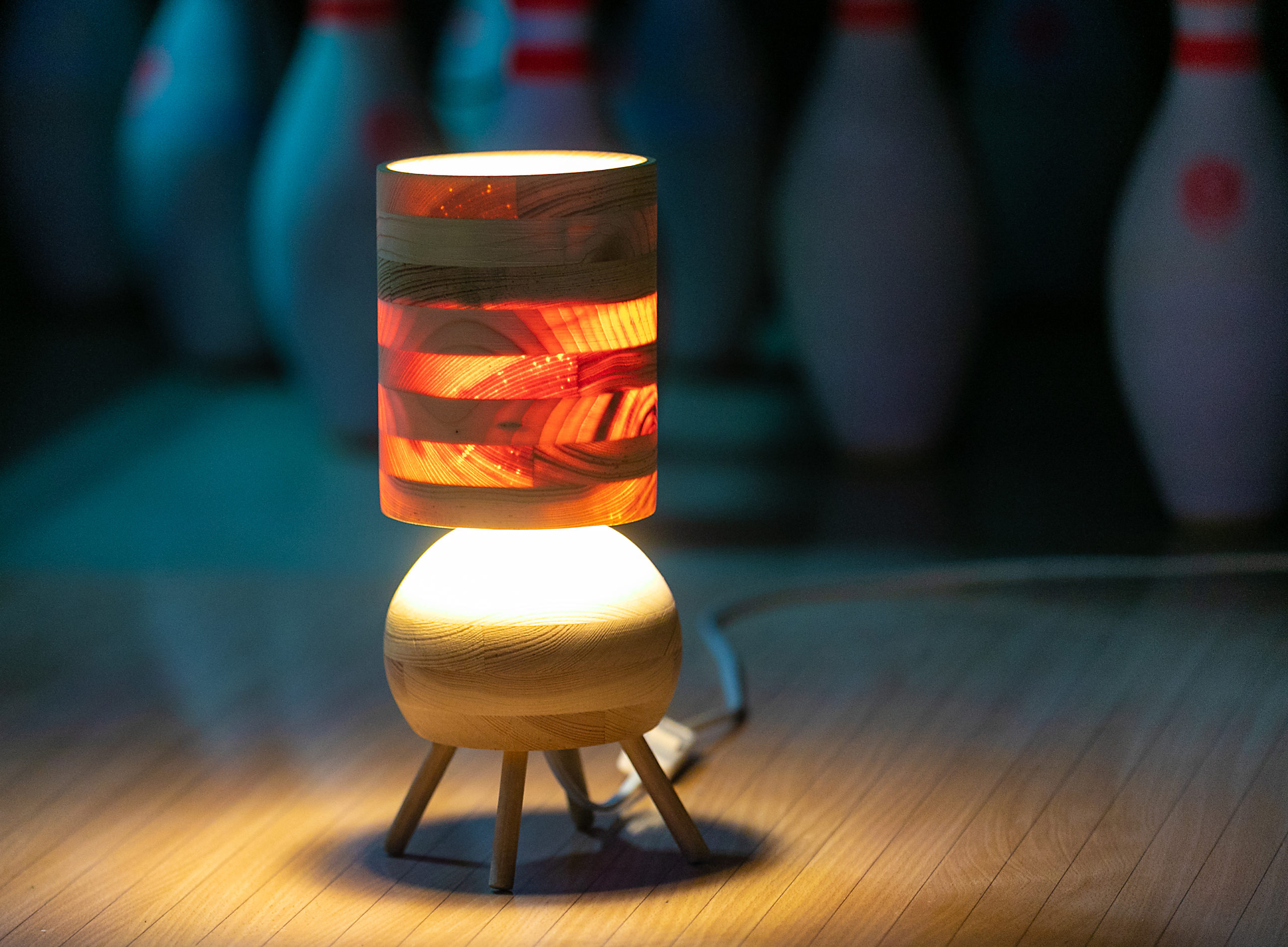 Przepuszcza światło przez cienki abażur, eksponując drewniane słoje. W komplecie żarówka LED