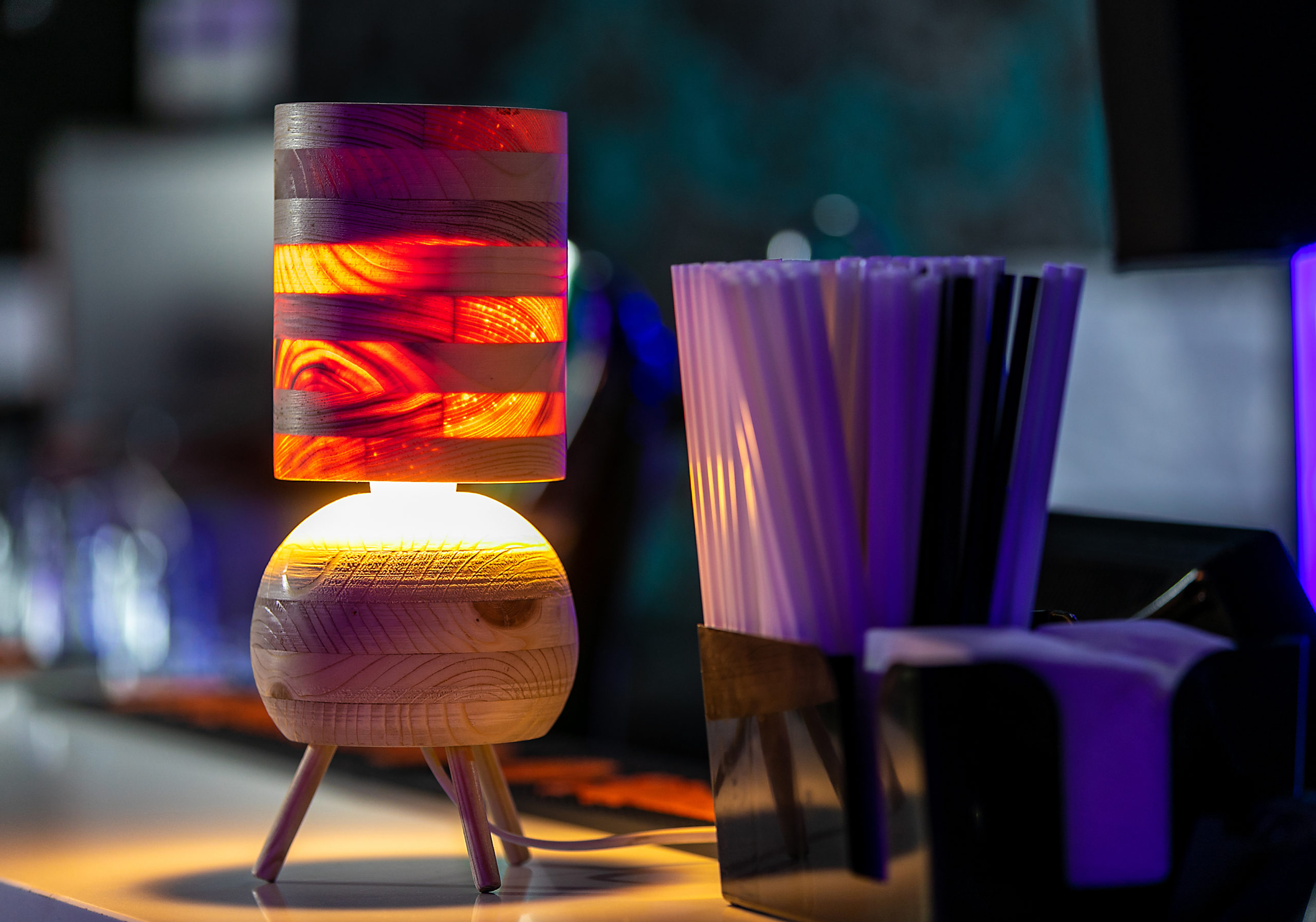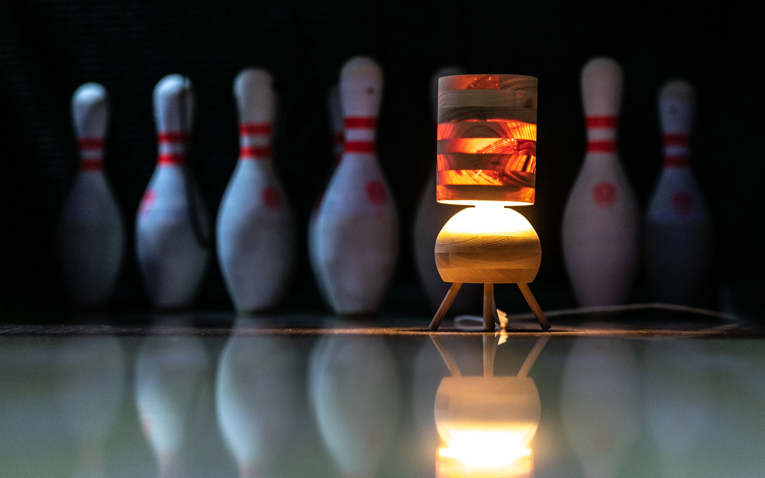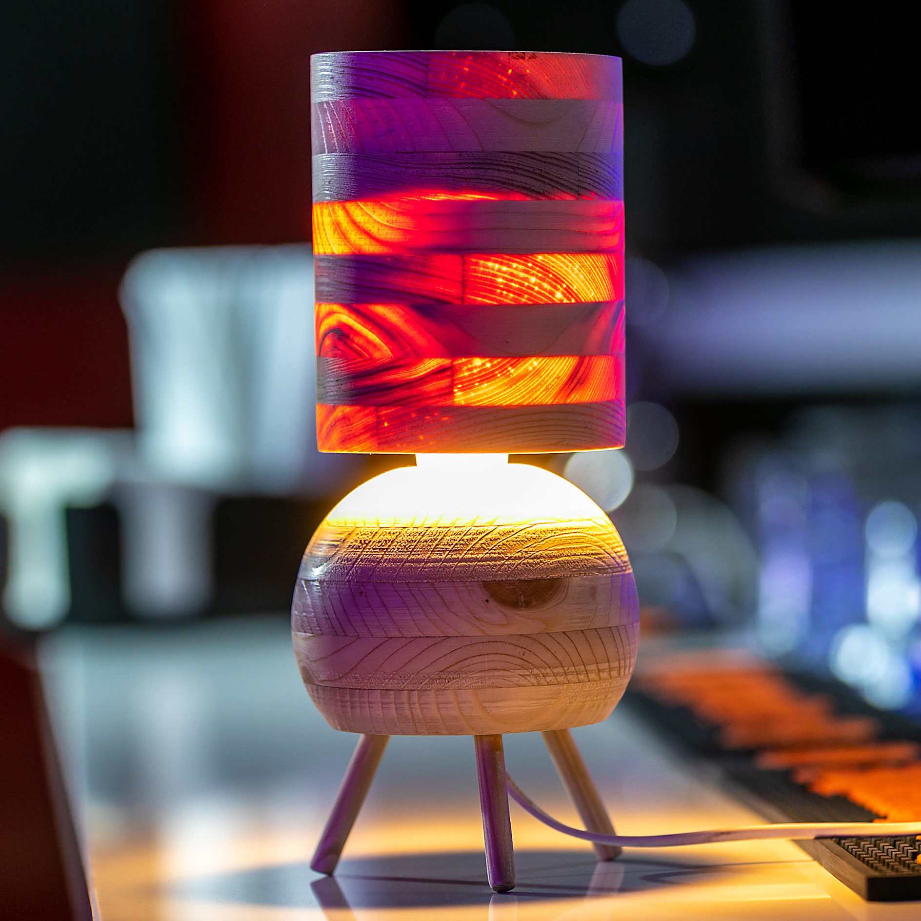 Przepuszcza światło przez cienki abażur, eksponując drewniane słoje. W komplecie żarówka LED